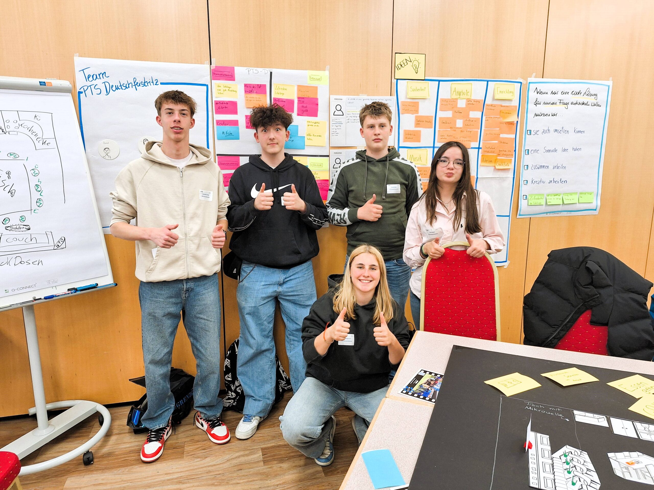 Das Ergebnis ließ sich sehen – gemütliche Couches für ein Pausenchillen, großer Esstisch für ein gemeinsames Essen und Unterhalten, mehr Steckdosen zum Aufladen der Handys, aktuelles Infoboard, online Kalender und eine gemeinsame Whatsapp-Gruppe, um rasch up-to-date zu sein.