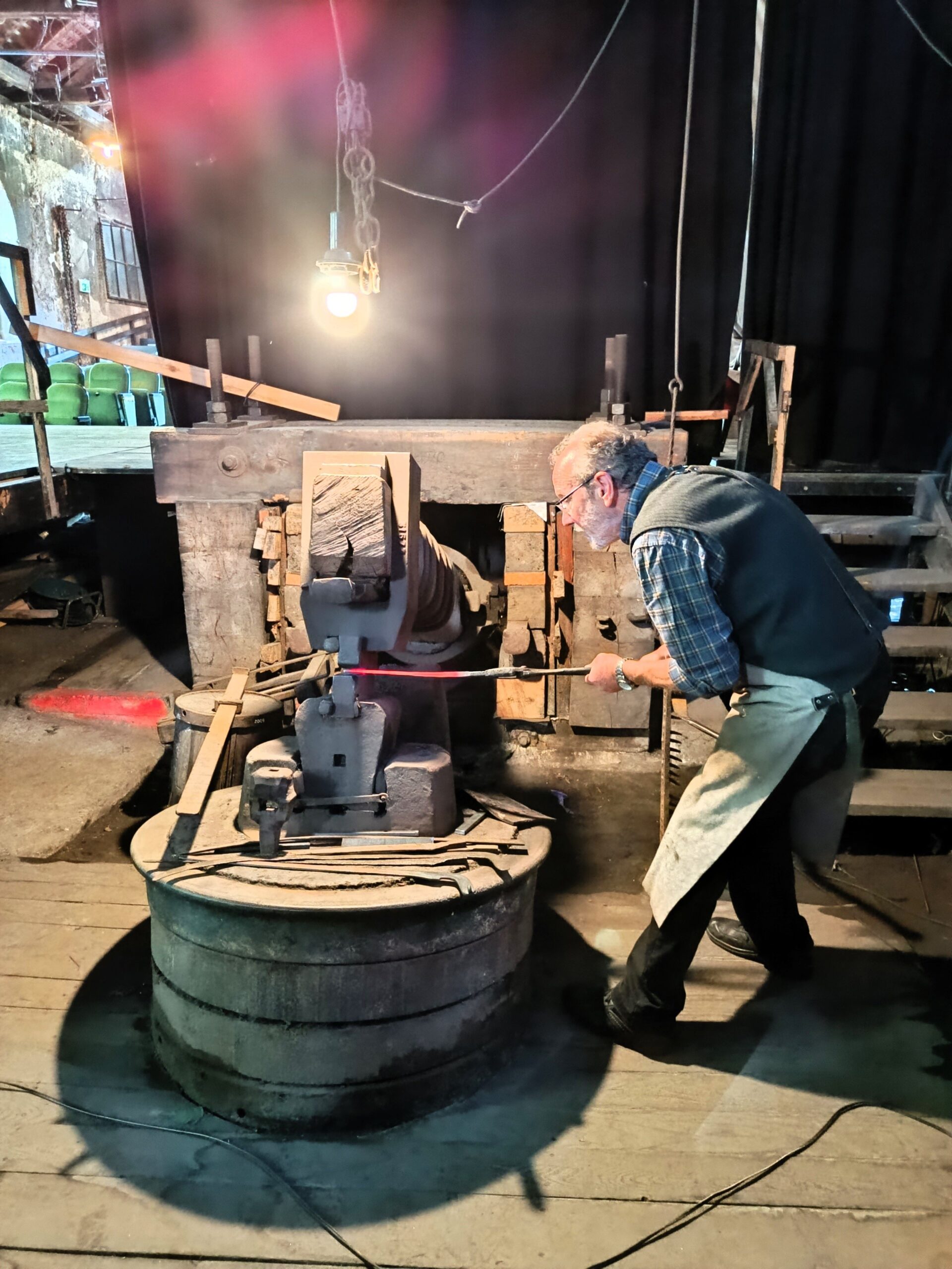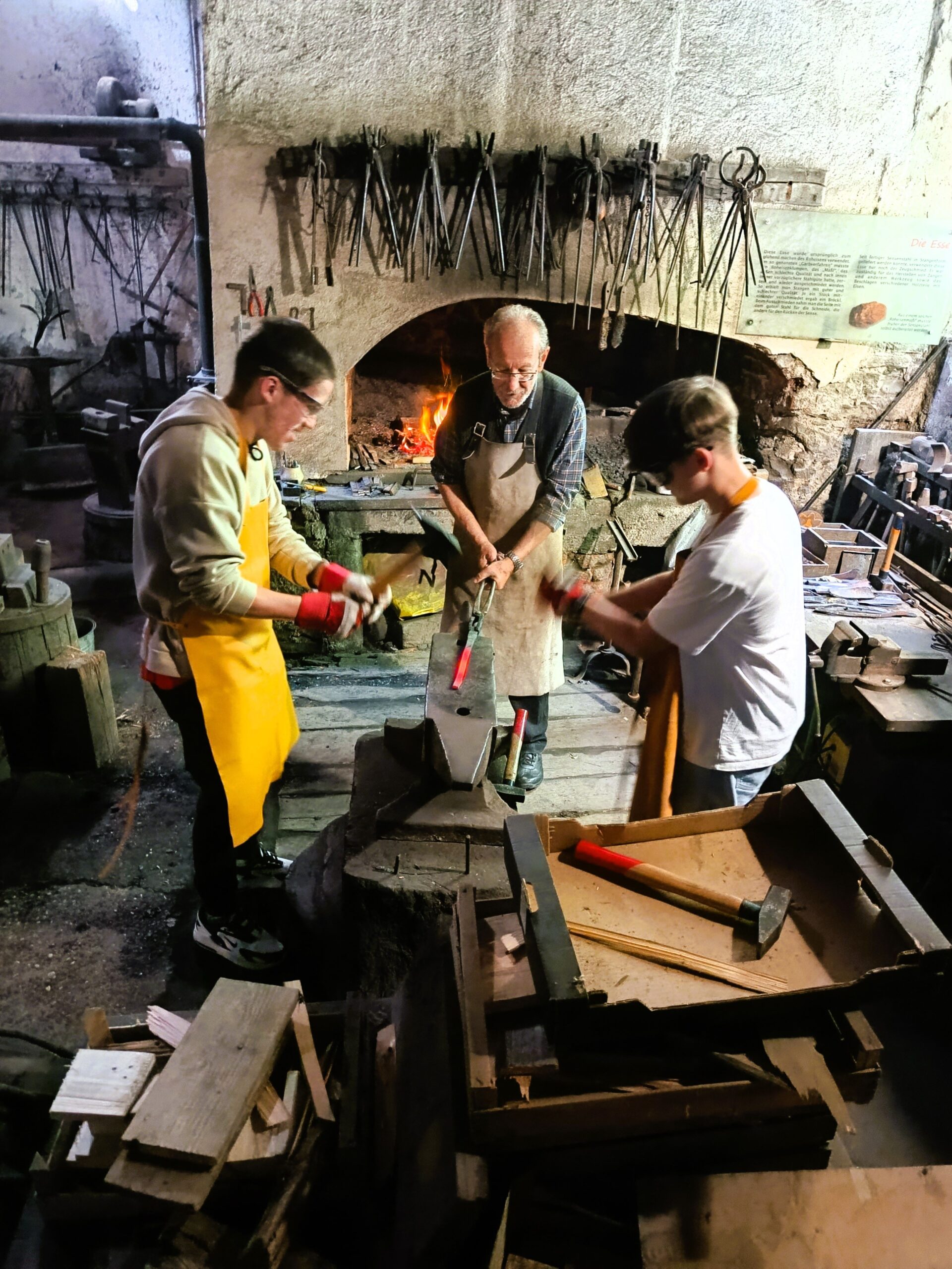Im Zuge eines Workshops wurden mit den großen Wasserrädern die schweren Schmiedeeisen und Maschinen betrieben und bei dumpfen Hammerschlägen das glühende Eisen geformt, bei dem die Jugendlichen mitarbeiten durften.
