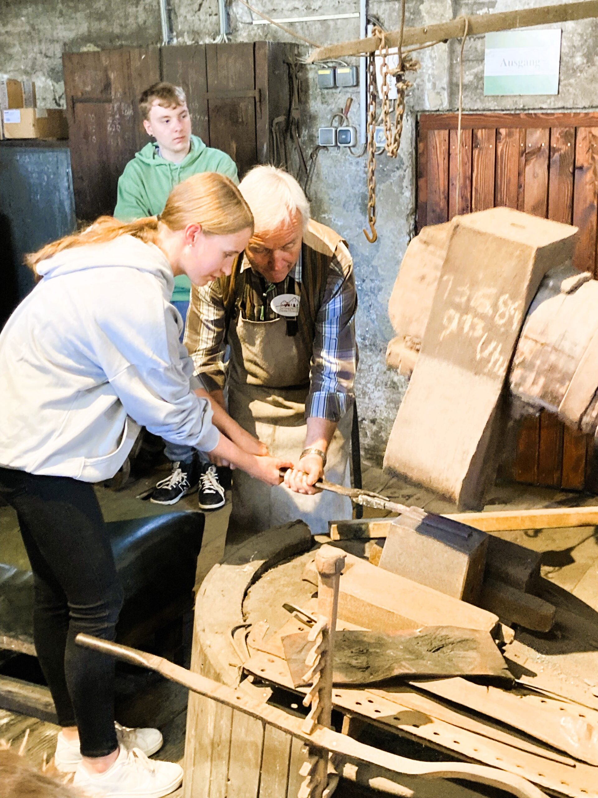 Dabei erhielten sie einen Eindruck von der langwierigen, schweren Arbeit auf dem Weg vom rohen Stahl zu einer hochwertigen Sense, die für die damalige Zeit das kostbare Werkzeug für das „tägliche Brot“ darstellte.