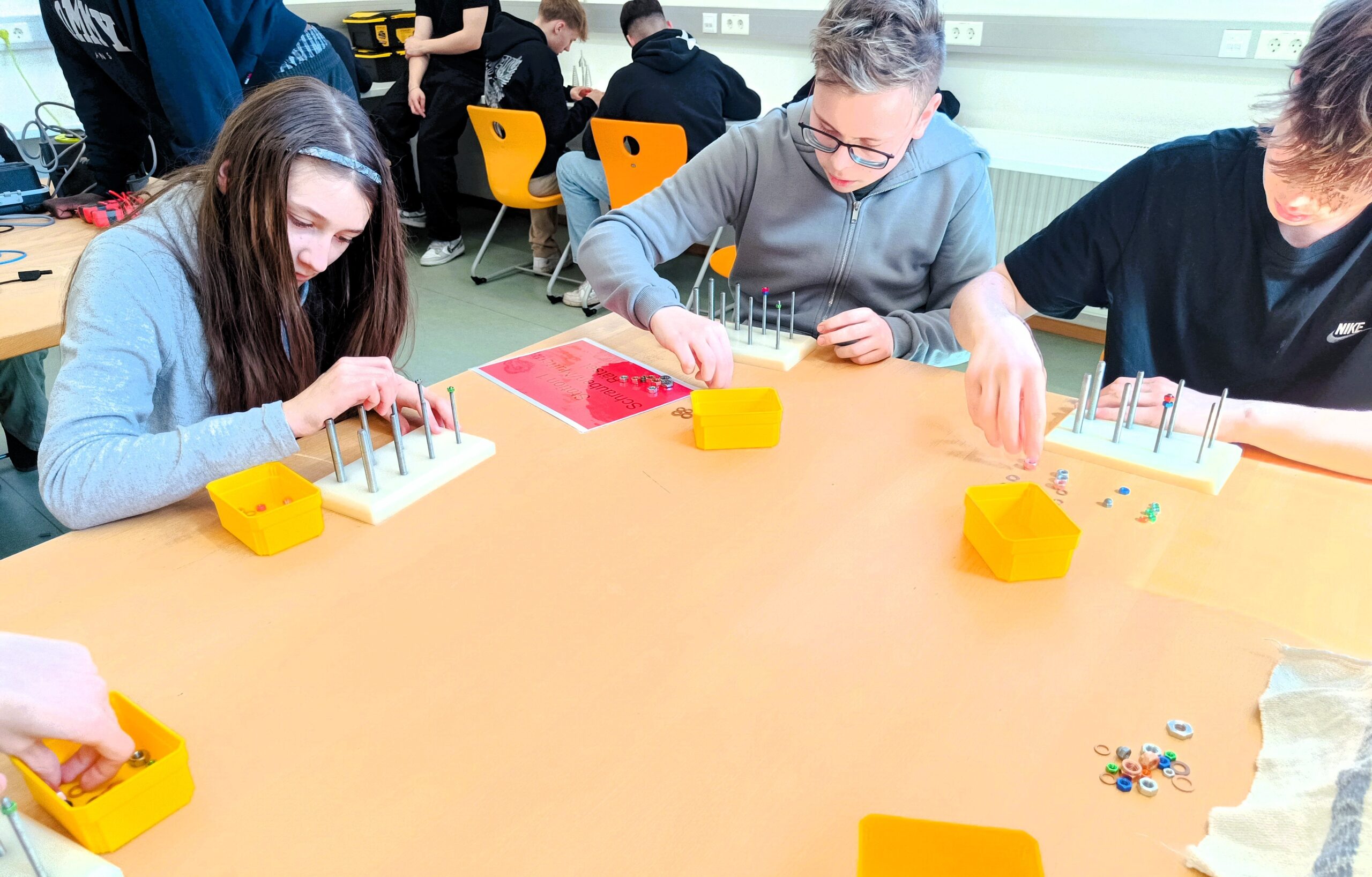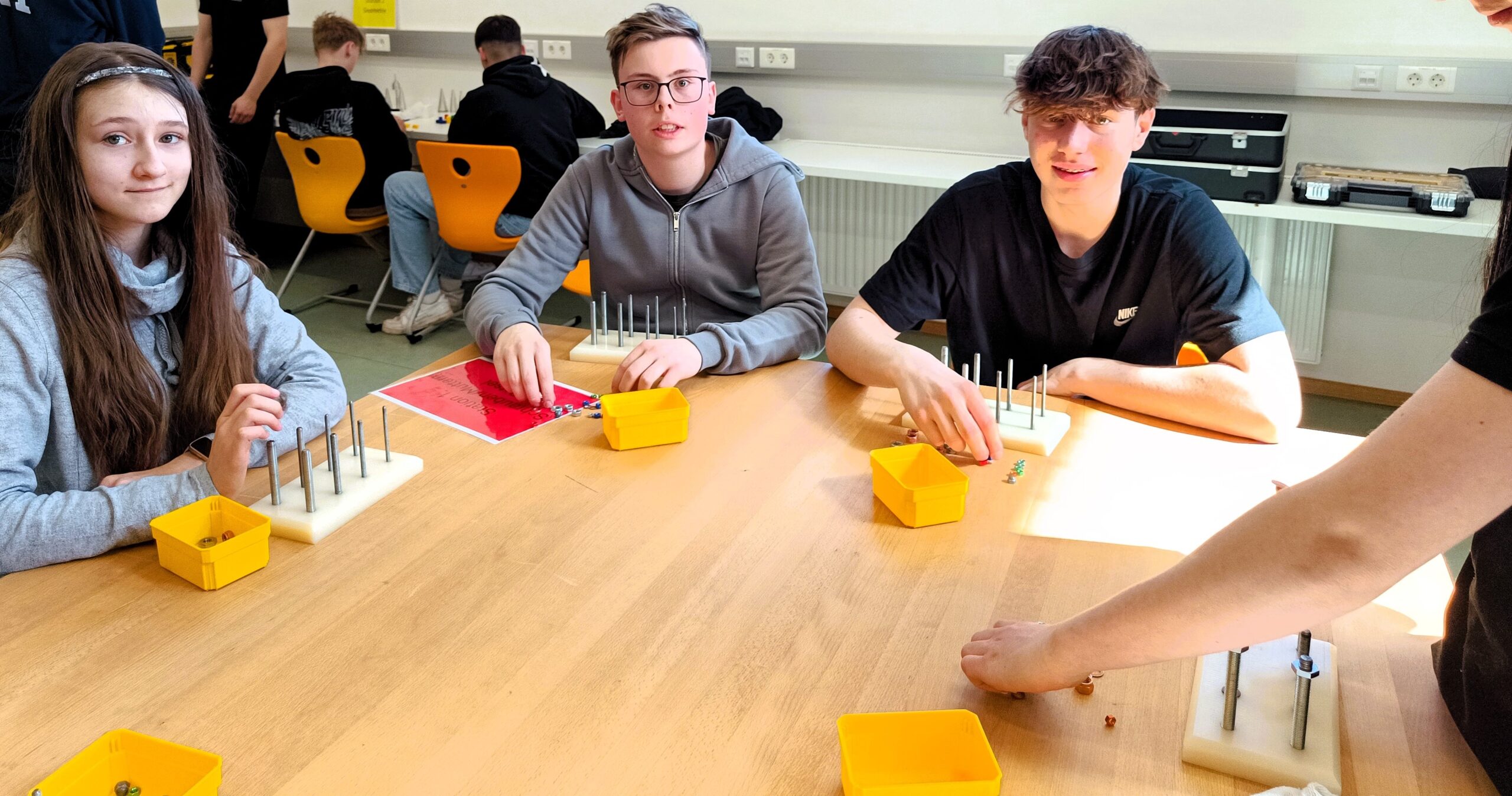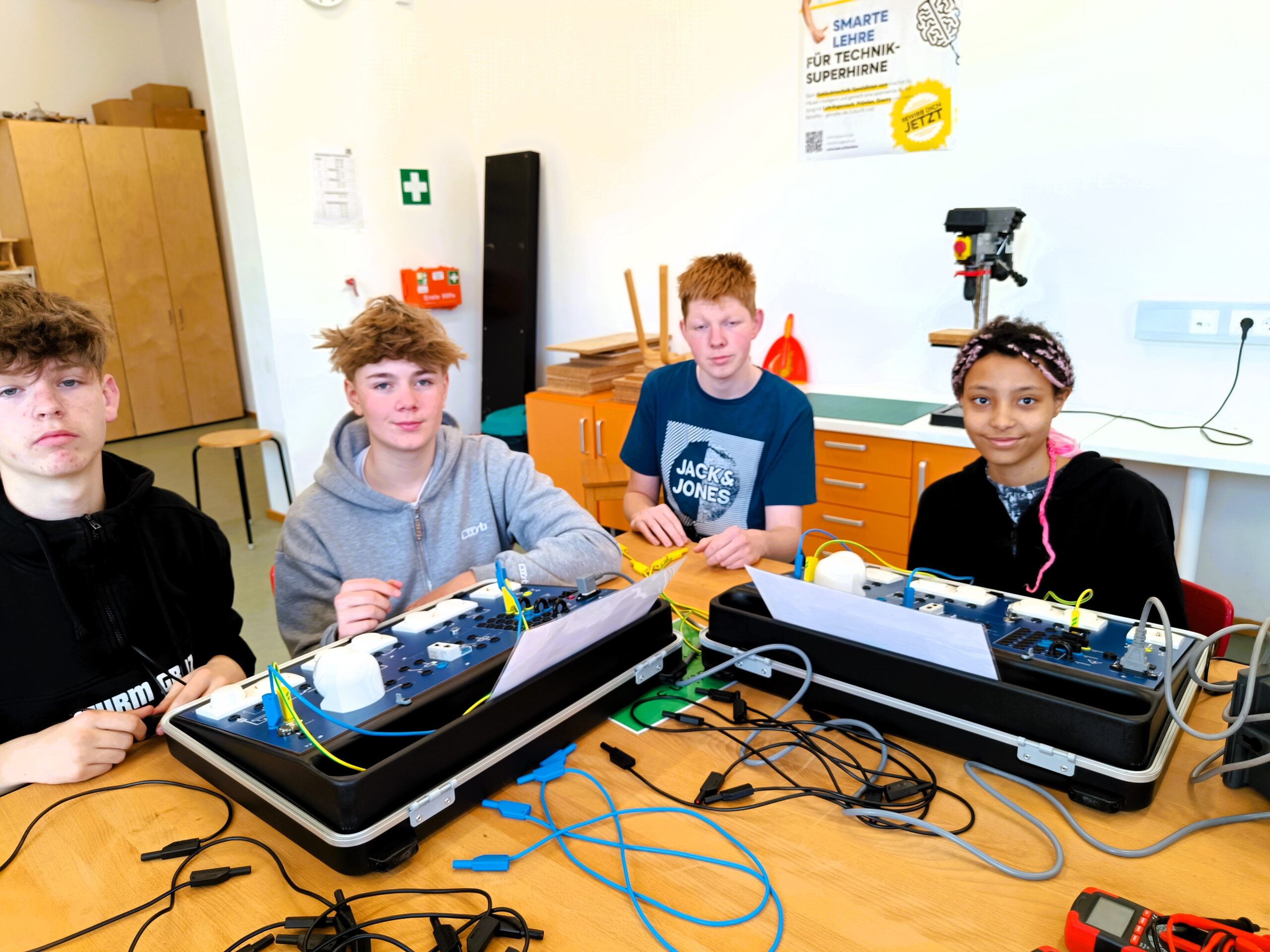 Die Schüler: innen hatten unterschiedliche Aufgaben an vier Stationen zu bewältigen, die von den Lehrlingen betreut wurden. Es wurden unter anderem eine Wechselschaltung simuliert und eine Elektronik – Schaltung gebaut.
