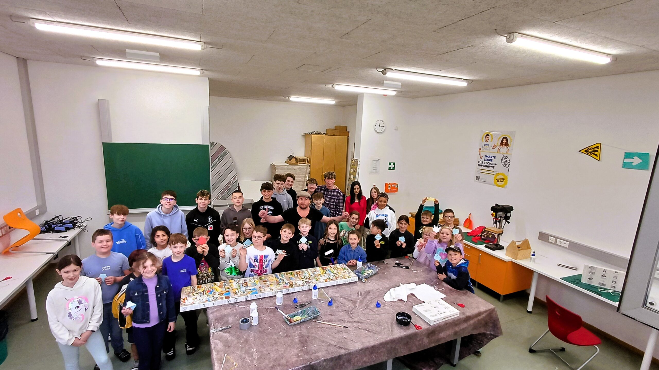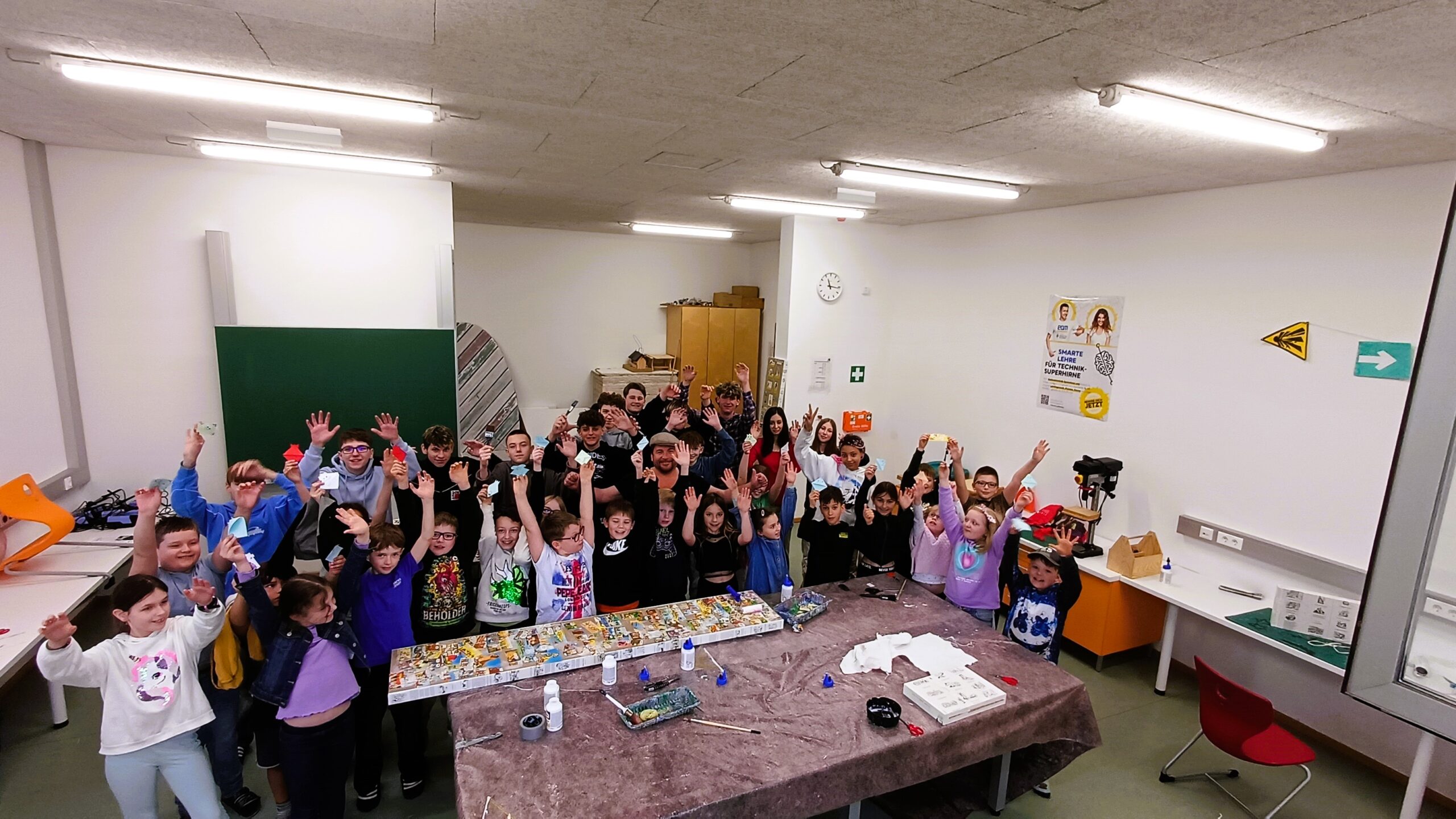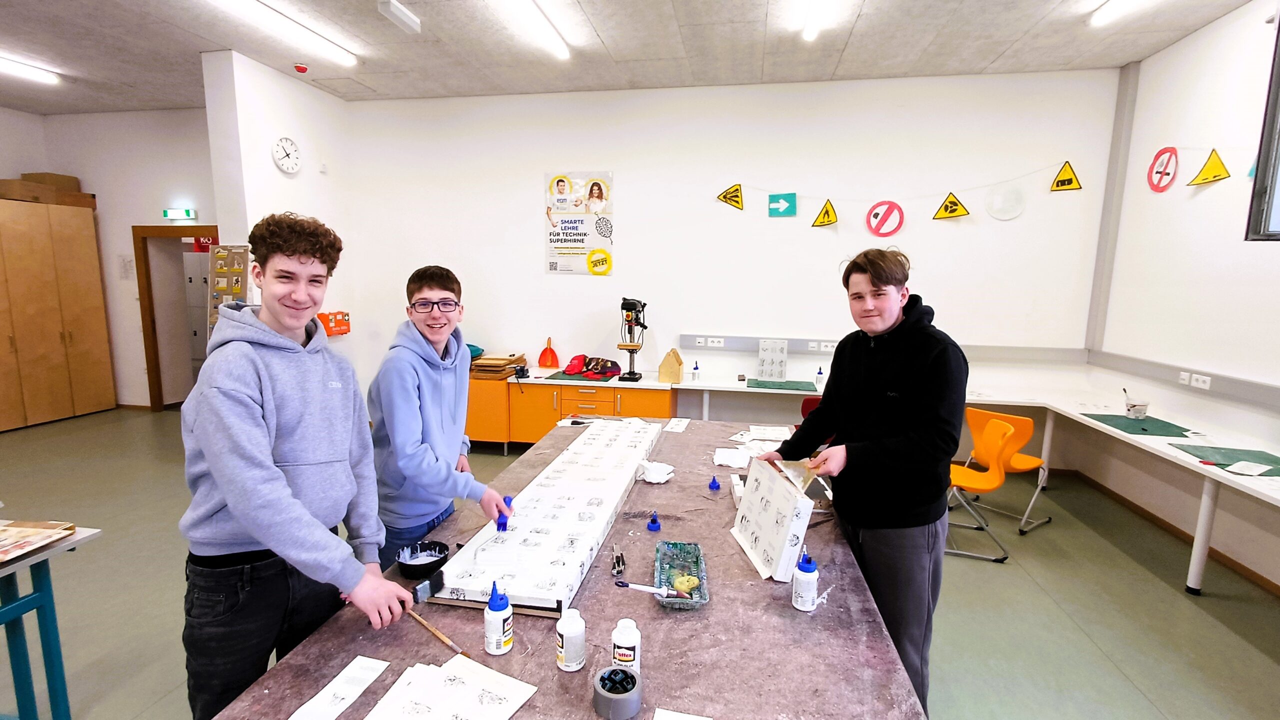 Im Anschluss an die Vorleseaktionen wurde es handwerklich: In einer gemeinsamen Aktion zwischen den beiden Schulen wurden Lesezeichen für die Volksschulkinder gefertigt. Die Kreativität der Schülerinnen und Schüler konnte hier voll zum Einsatz kommen. Zudem stand als weiteres Highlight des Tages das Neugestalten eines alten Bücherregals auf dem Programm. Dieses wurde mit märchenhaften Motiven und Bildern aus Asterix-Comics neu tapeziert und erhielt so ein frisches, modernes Design.