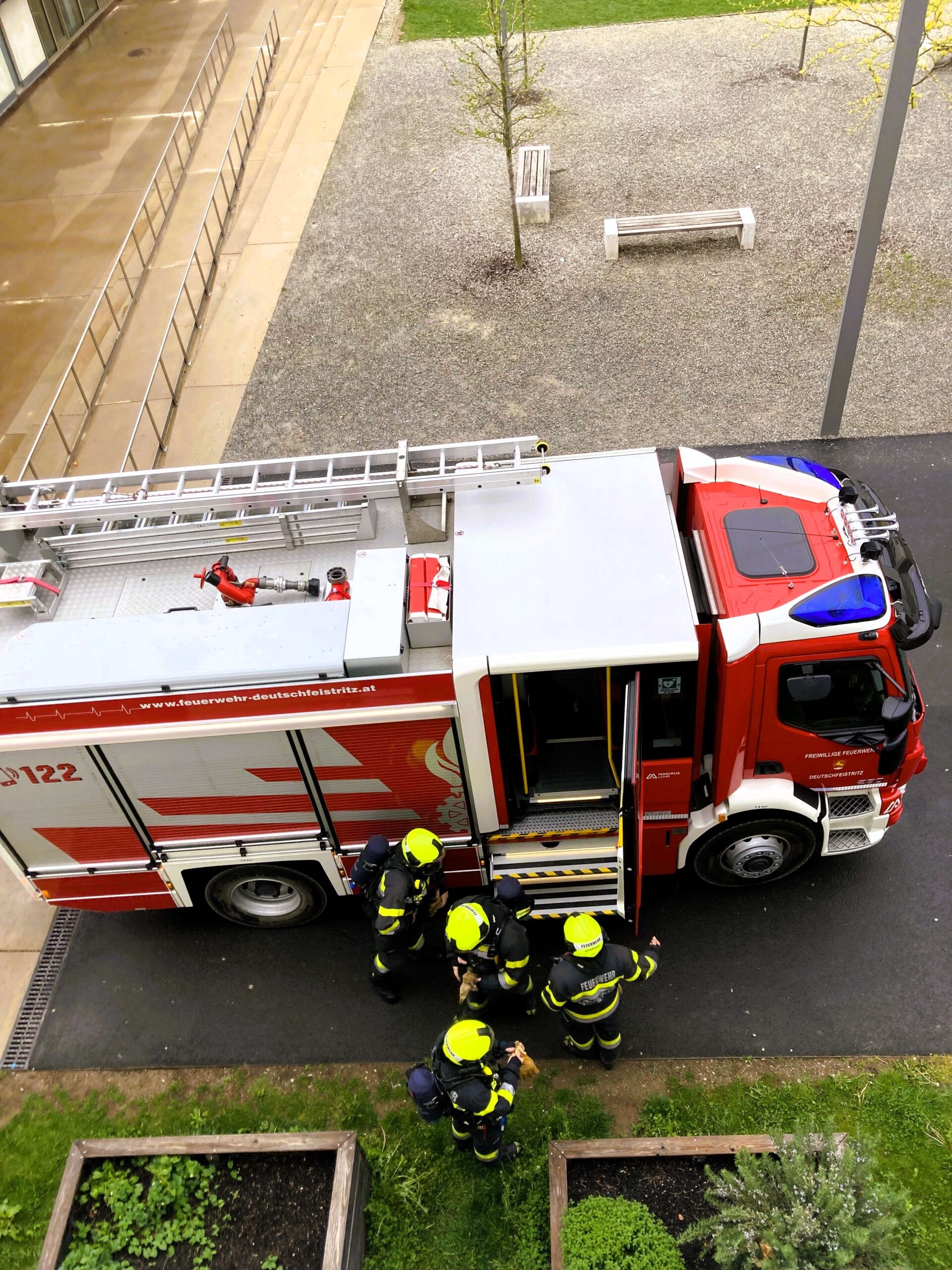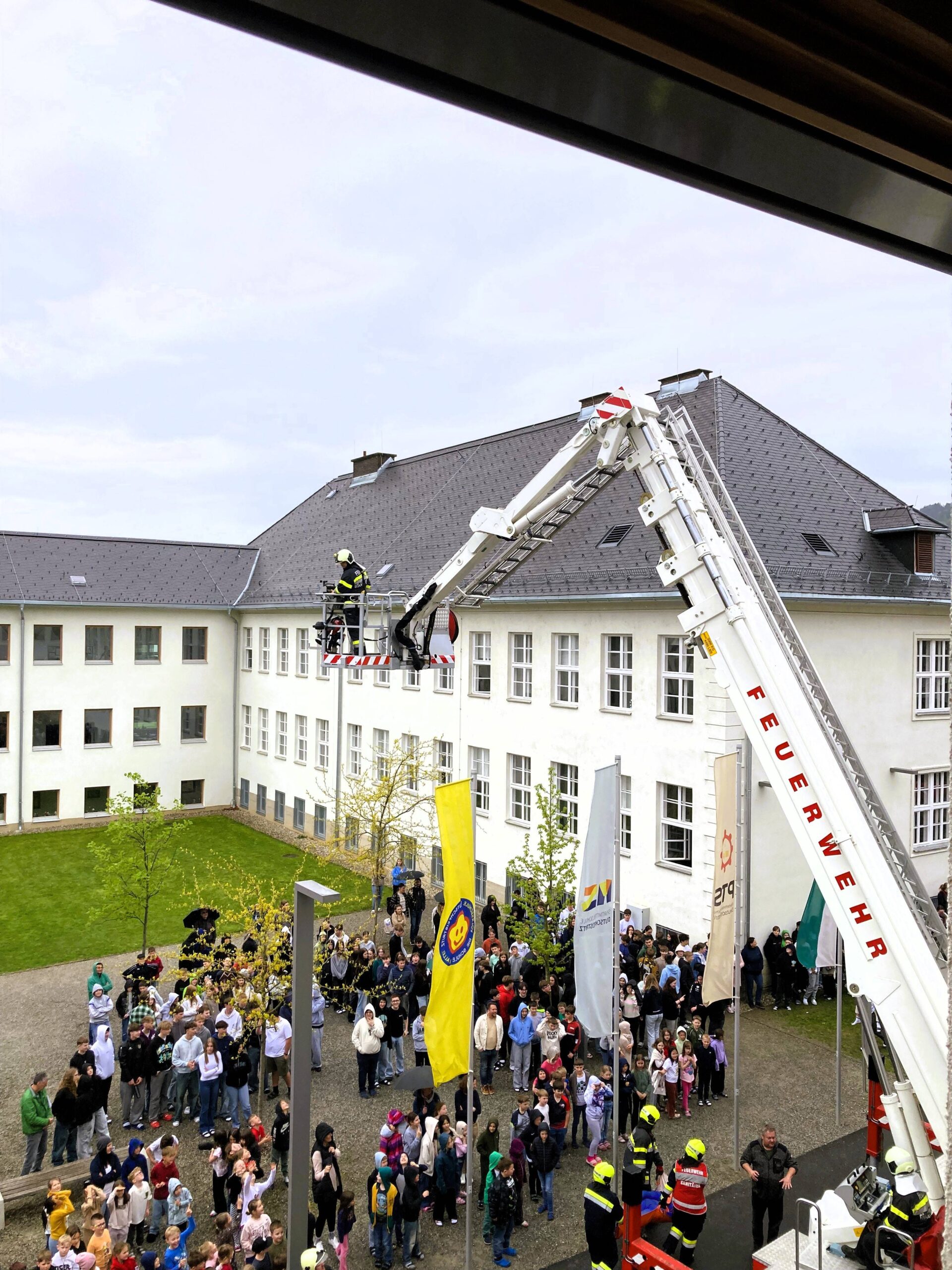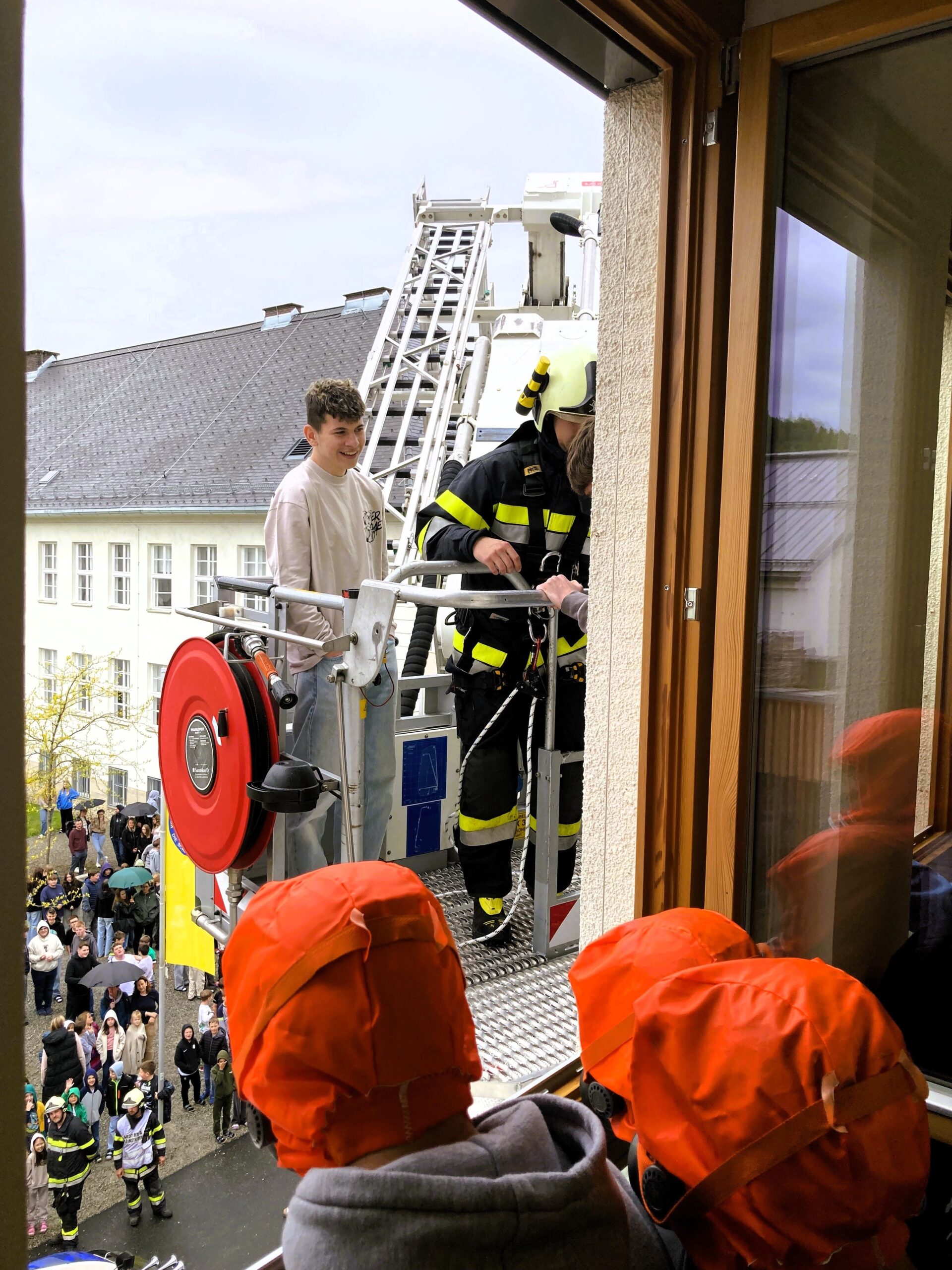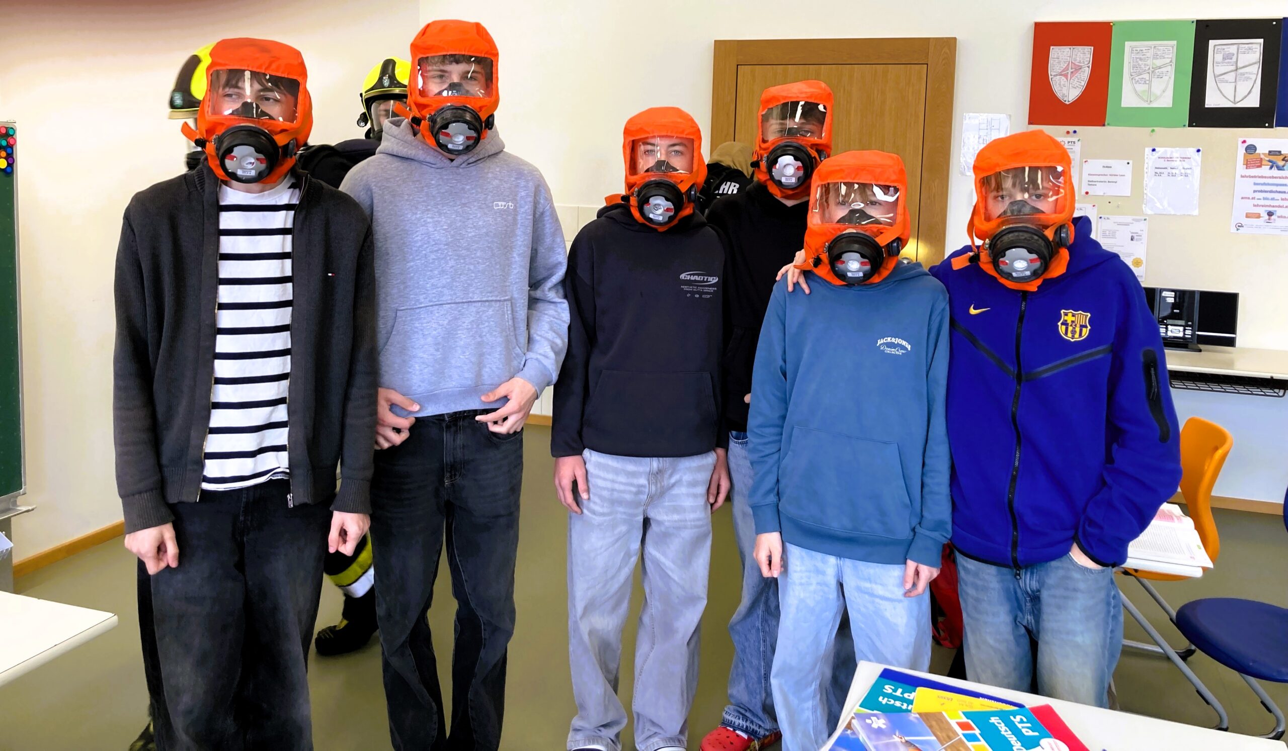 Einige Schüler wurden mit Fluchthauben ausgestattet und sicher über das Stiegenhaus ins Freie gerettet.