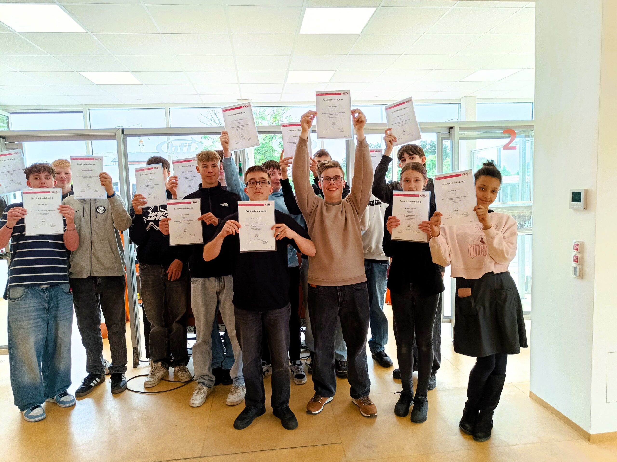 In vier Stunden erhielten die Jugendlichen einen ersten Einblick in die Welt der Roboter-Programmierung. Sie erlebten den sicheren Umgang mit Industrierobotern und erlernten grundlegende Kenntnisse über den Aufbau eines Robotersystems. Die einzelnen Gruppen stellten sich der Challenge mit einem Roboterarm Metallwürfel zu einem Turm übereinander zu stapeln. Die Schüler leisteten hervorragende Arbeit und zum Schluss wurden sie zur Belohnung mit einer Jause und Getränken versorgt.