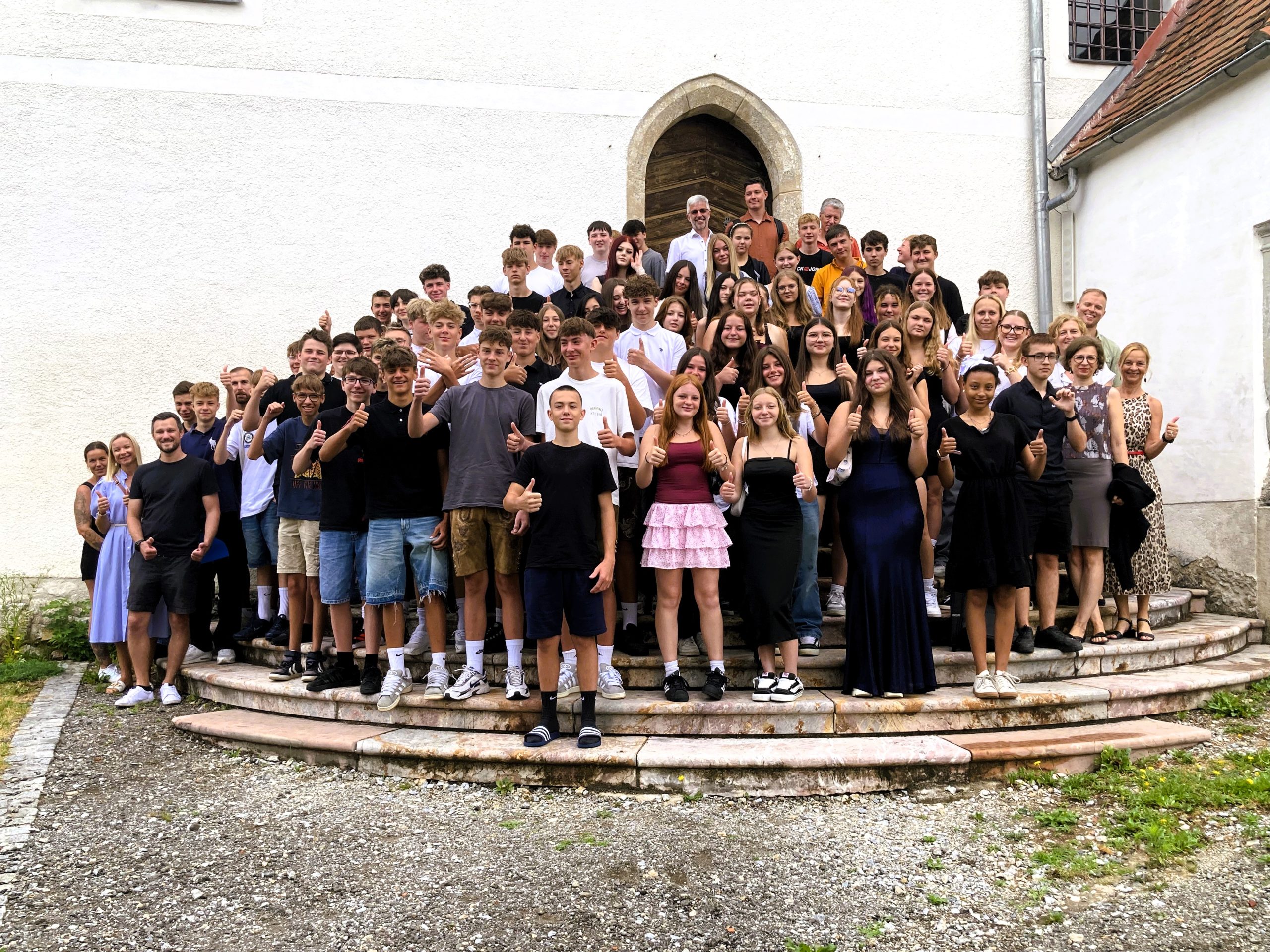 Nach ausgiebigem Badespaß im Freibad Frohnleiten bei hochsommerlichen Temperaturen fanden sich am Zeugnistag alle Schüler und Schülerinnen zu einem Gottesdienst am Deutschfeistritzer Kirchberg ein. Bei der anschließenden Zeugnisverteilung flossen unhaltsam viele Tränen. Viele enge Freundschaften entstanden und viele gemeinsame Projekte machten Spaß und Freude.